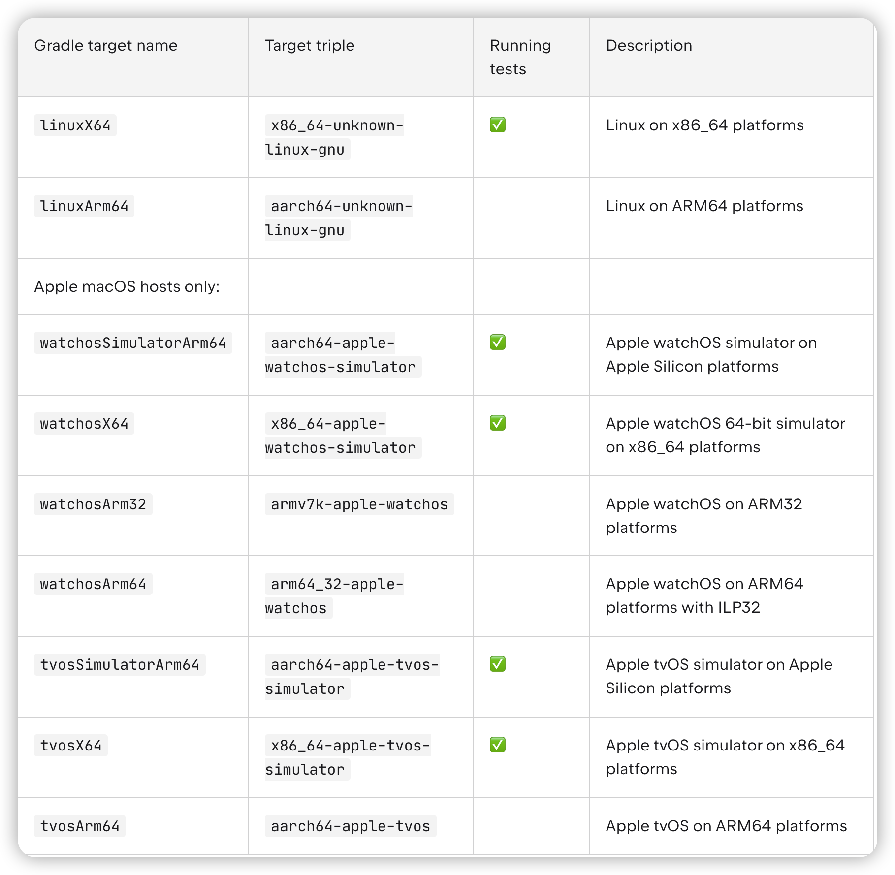 | Kotlin/Native | Learn about currently supported targets for the macOS, Linux, and Windows hosts in Kotlin/Native target support. | |