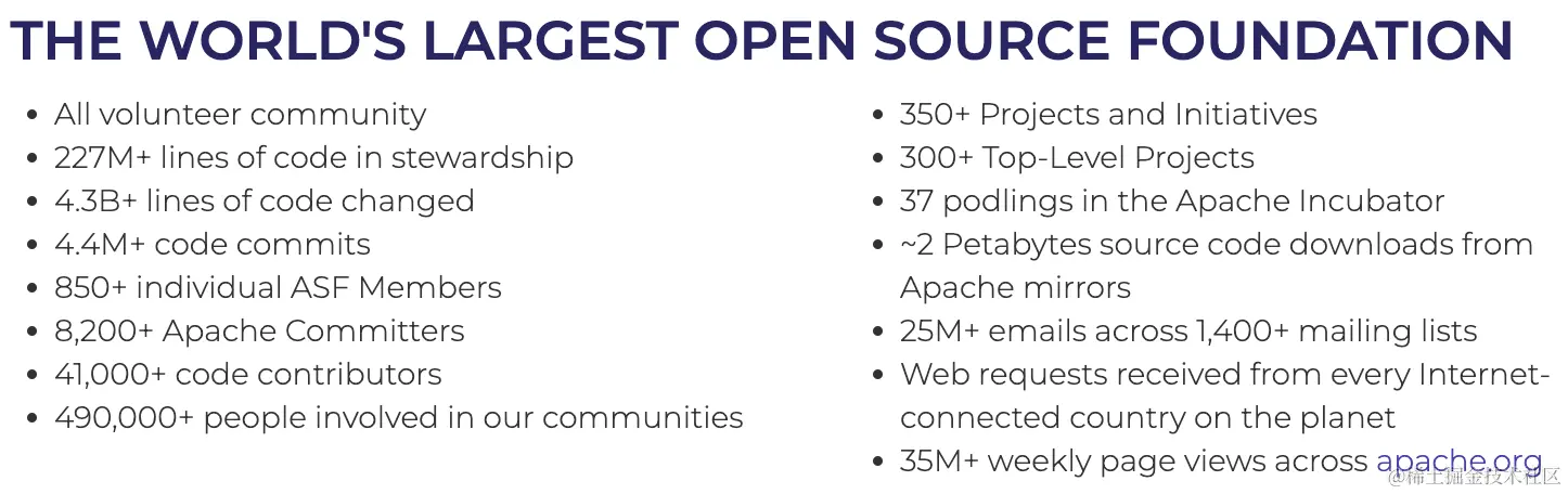 Bonus:与Apache Software Foundation(ASF)影响力同样巨大的是Linux Foundation(LF),其陆续衍生出垂直领域的基金会,如Cloud Native Computing Foundation(CNCF)、LF Edge、LF AI & Data、GraphQL Foundation和近期才成立的eBPF Foundation。