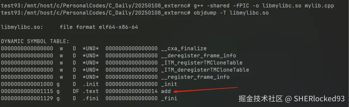 可以看到这个符号就叫 add,没有经过名称修饰,也就是说如果声明了 extern "C" ,确实影响了链接器生成符号时的名称修饰行为。