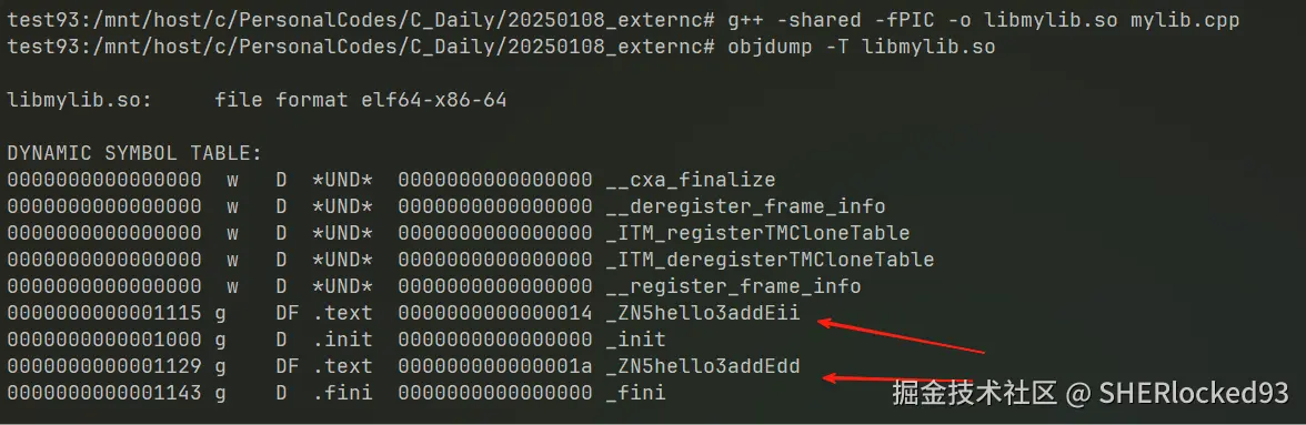 在 Linux 环境下,使用 g++ 执行编译,设置导出动态库为 libmylib.so,然后查看导出的动态库中的符号: