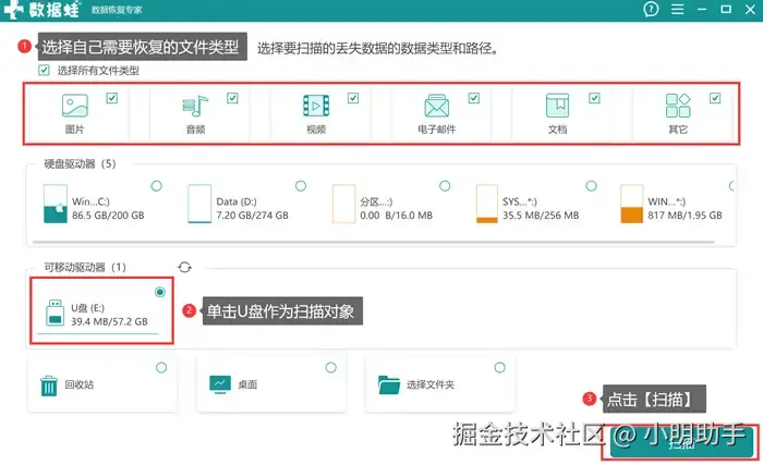 步骤1: 在软件的主页面上选择好扫描的文件类型和U盘,点击【扫描】;