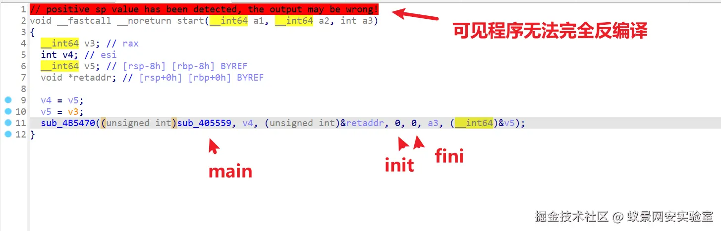 程序无法完全反编译,并且发现init和fini均无法正常识别。