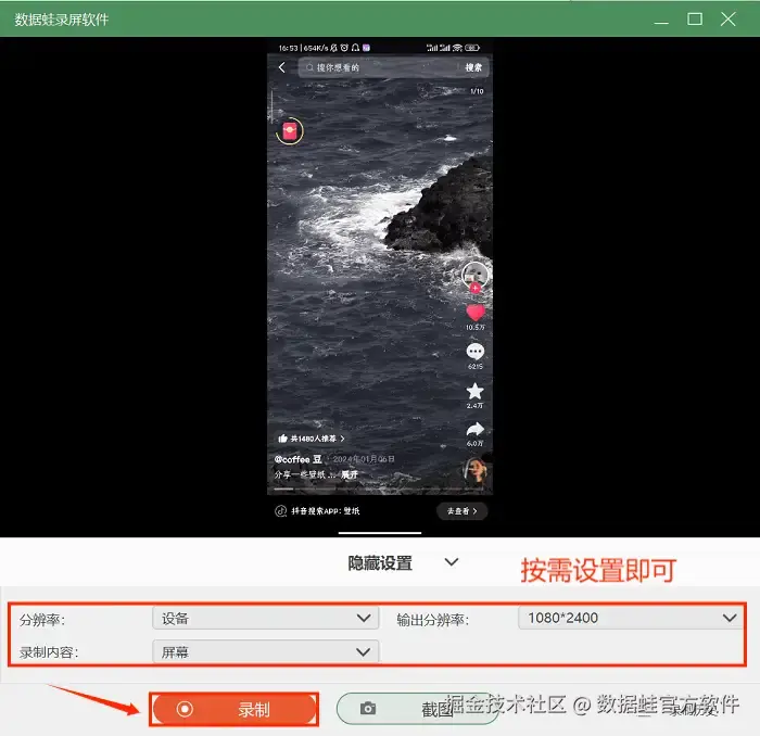步骤3:手机连接上电脑后,我们就可以在电脑上看到实时的手机屏幕页面了。这个时候我们可以自由调整录制的参数,全部搞定后点击“录制”按钮就可以开始录制抖音直播了。