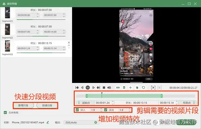 步骤4:录制结束后,我们可以点击“高级剪辑”选项对视频进行后期剪辑操作,如快速分段视频、剪辑需要的视频片段等。