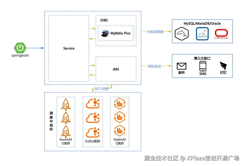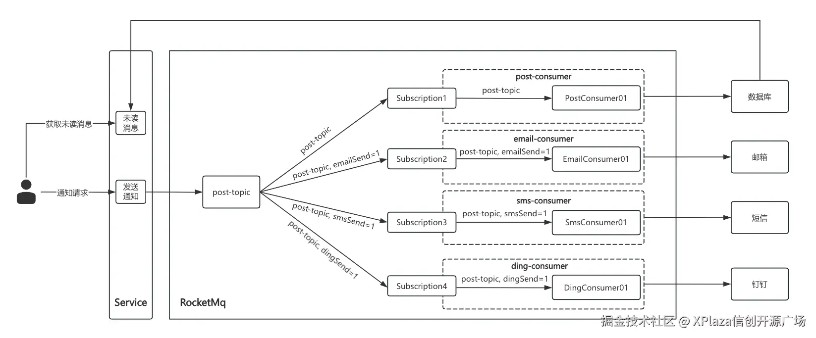 XNotice 的设计理念是模块化和高可扩展性。当前版本基于 RocketMQ 作为消息中间件,支持通知消息的客制化,未来还将支持 Kafka 和 RabbitMQ 等其他中间件。
