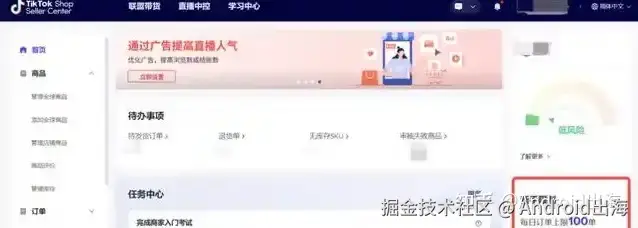 l 启示:新店铺创建后,商家可在TikTok shop卖家中心后台首页,点击“新手限制”模块查看订单每日上限。商家点击“更多”即可跳转到新店铺考察期介绍页面,商家能在此页面查看每日已有订单,订单上限,以及通过考察期的方法。