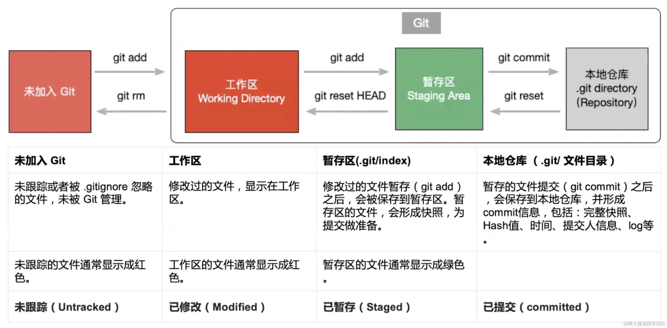- 暂存区: 英文叫 stage 或 index。一般存放在 .git 目录下的 index 文件(.git/index)中,所以我们把暂存区有时也叫作索引(index)。(当我们写完一部分代码可以使用git add将文件提交到暂存区,暂存区起到一个快照的作用,当出现重大错误操作时,可以通过回退git reset回退到错误发生之前的版本)