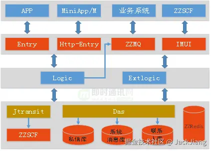 用户层是IM服务的调用者,用户层支撑各类业务应用,包括APP、小程序、M端、平台运营类业务系统和ZZRPC。