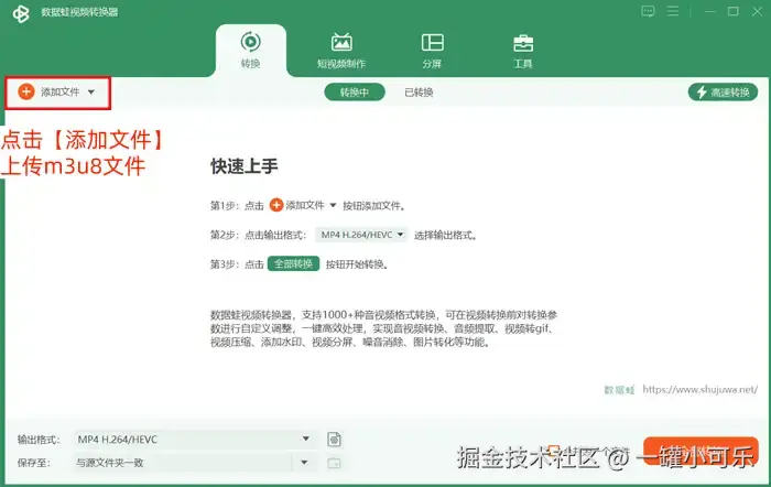 步骤1:点击打开该格式转换应用,在格式转换界面中点击【添加文件】上传m3u8文件。