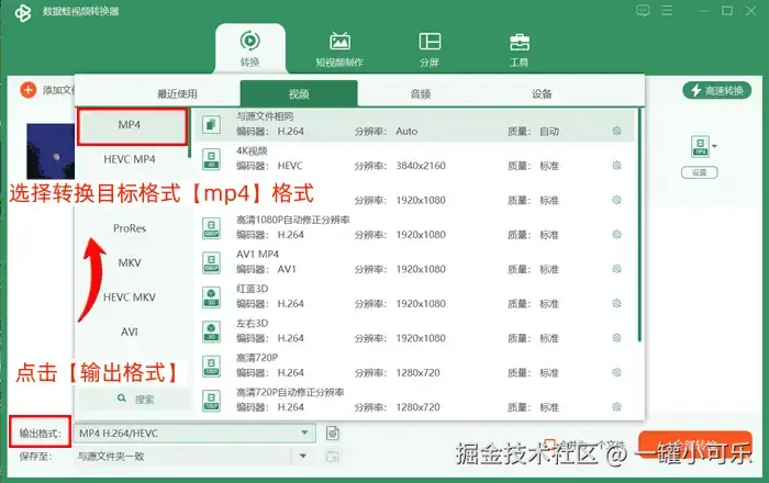 步骤2:点击【输出格式】选择转换目标格式【mp4】格式。
