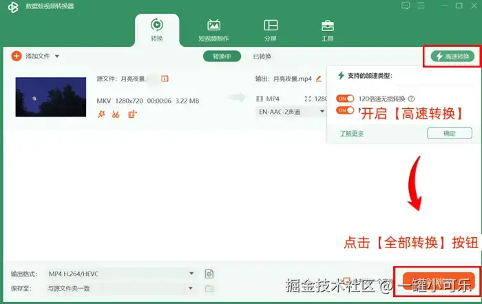 步骤3:返回转换界面,点击【高速转换】,然后点击下方的【全部转换】按钮。