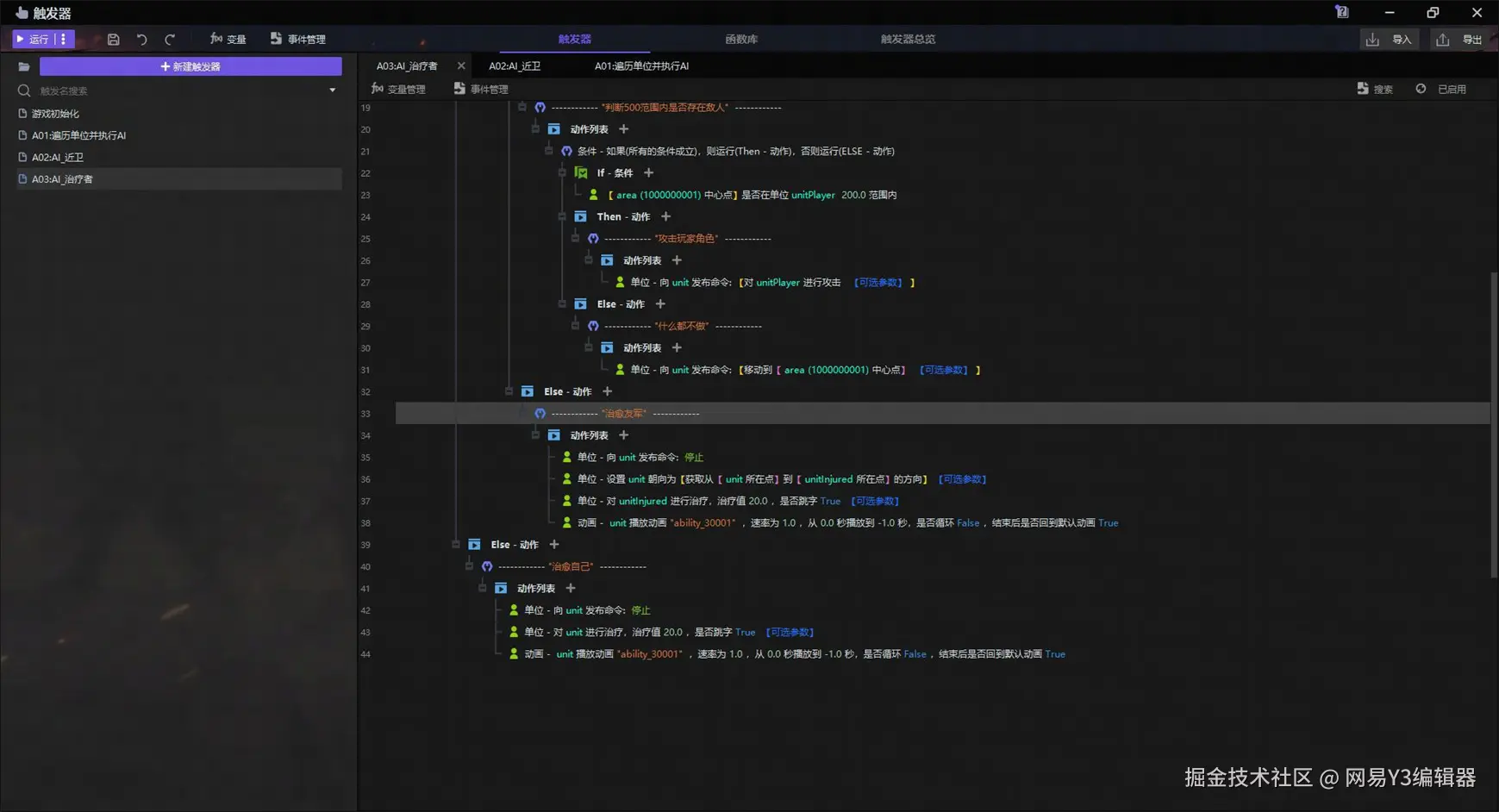 如果守卫单位本身的HP不安全,则给单位unit向全局变量中的治疗者unitHealer一个移动指令。 如果守卫单位本身是安全的,则判断AI警戒区域(在本示例中为一个圆形区域)内是否有敌人。