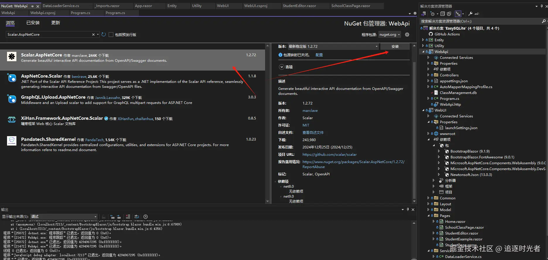 在NuGet包管理器中搜索:Scalar.AspNetCore (支持.NET 8和.NET 9)选择安装: