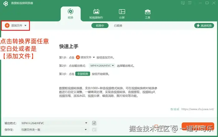 步骤1:打开数据 蛙视频转换器,点击转换界面任意空白处或者是【添加文件】上传需要提取音频的视频文件。