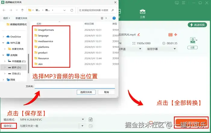 步骤3:点击【保存至】选择MP3音频的导出位置,然后点击【全部转换】即可。