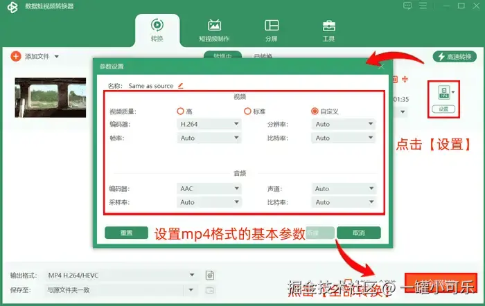 步骤3:在格式转换界面,点击【设置】标志,设置mp4格式的基本参数,然后再点击【全部转换】选项。