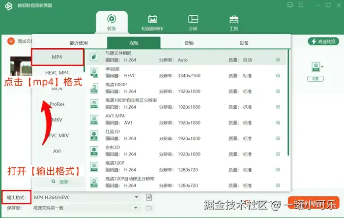 步骤2:打开【输出格式】,点击视频格式列表下的【mp4】格式。