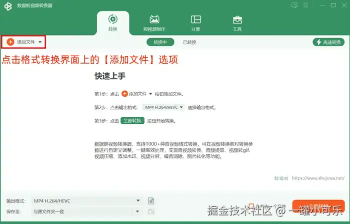 步骤1:点击打开数据 蛙视频转换器,点击格式转换界面上的【添加文件】选项,添加mts文件。