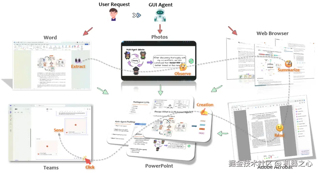 虚拟助手不再局限于简单的闹钟设定或天气查询。当 LLM 赋能的 GUI 智能体成为虚拟助手的「大脑」时,我们得到的是一位真正的「多面手」—— 可跨越桌面、手机、Web 浏览器和企业应用,以自然语言命令为指引,自动完成从文档编辑、数据表格分析,到复杂手机操作流程的各种任务。