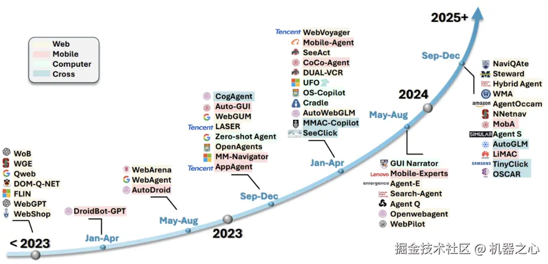 在大模型的加持下,GUI 智能体为人机交互带来了质变的提升。用户仅需自然语言指令,智能体即可完成原本需要繁琐点击和复杂操作才能达成的目标。这不仅降低了用户的操作和学习成本,也减少了对特定软件 API 的依赖,提升了系统通用性。如图 2 所示,自 2023 年以来,以大模型驱动的 GUI 智能体为主题的研究层出不穷,逐渐成为前沿热点。