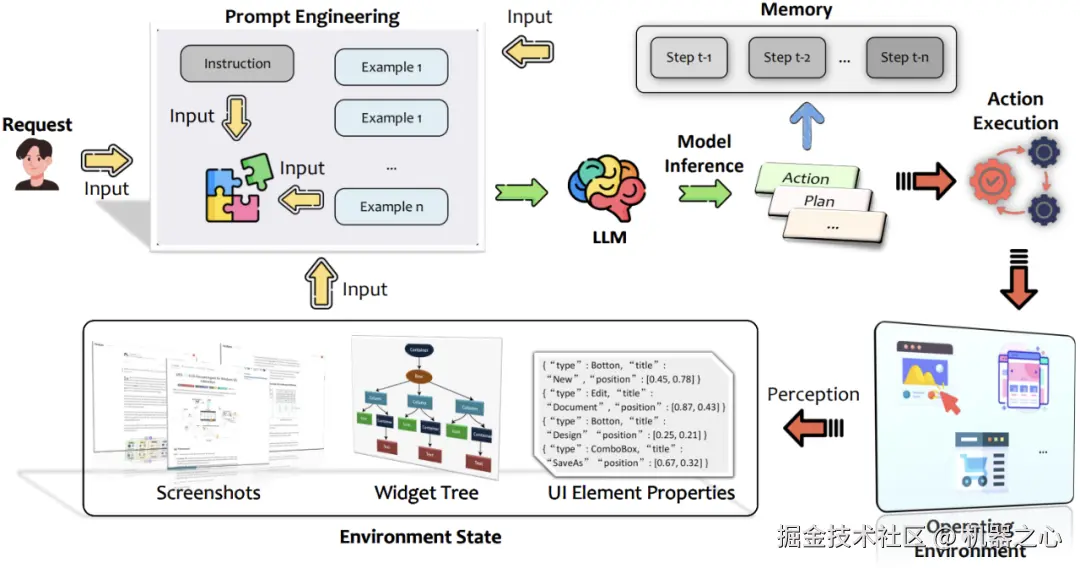 智能体将用户指令与当前 GUI 状态相结合,构建输入提示(Prompt),并利用大语言模型生成下一步操作计划。例如:「用户指令 + 界面截图 + UI 元素属性」 经过 LLM 处理后,智能体将输出明确的操作步骤(点击、输入、拖拽等)。