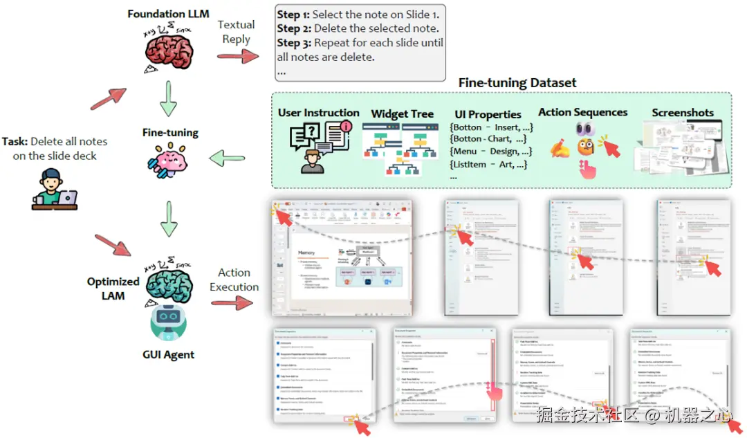 综述提出了「大行动模型」(Large Action Model, LAM)的概念,在 LLM 的基础上进行微调,以解决 GUI 智能体任务执行中的核心难题: