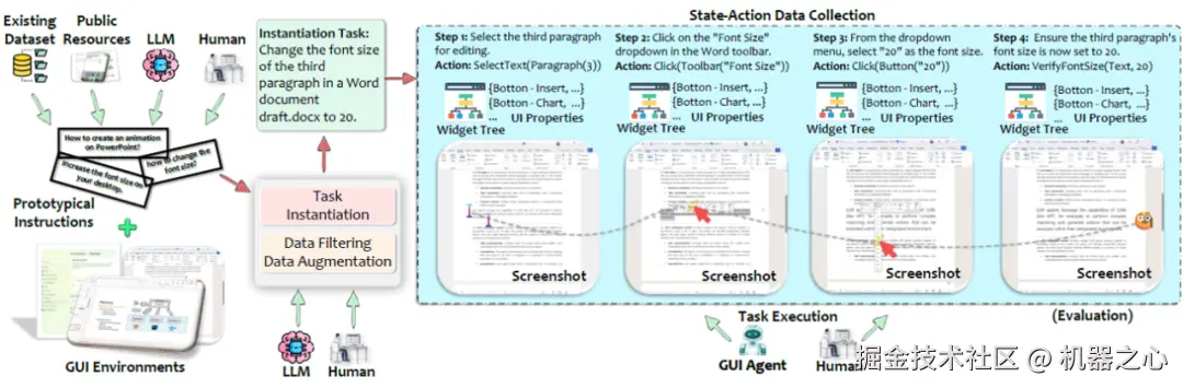 这些数据为训练与测试提供了基础,也为领域标准化评估奠定了坚实的根基。图 4 展示了训练 GUI agent 的数据采集流程。