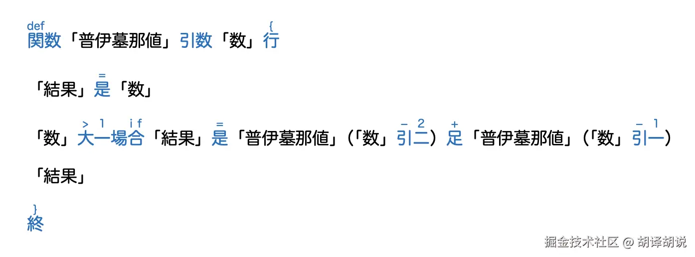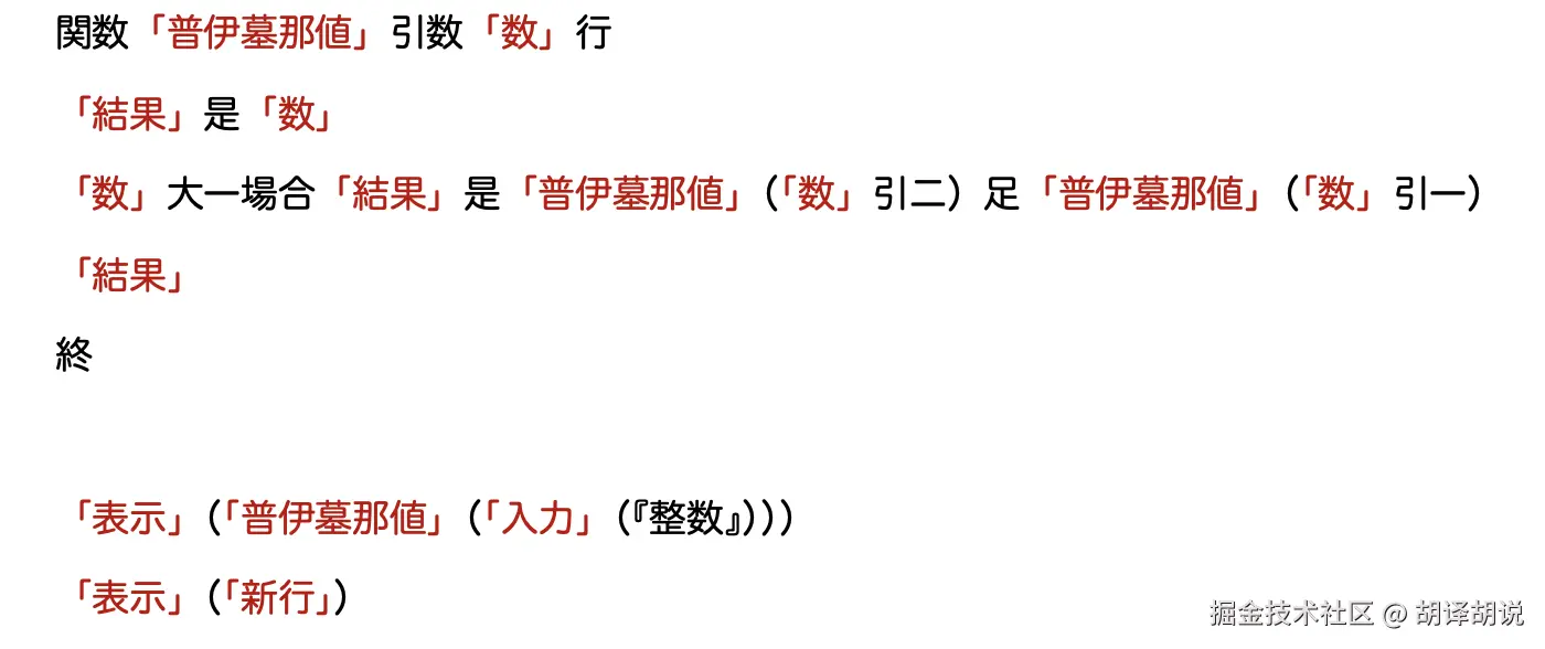 代码中还有些汉字没有括在「」之中,除了表示数字的零一二三四五六七八九,剩下的那些汉字相当于运算符和关键字。如 関数 相当于 Python 中的 def,表示开始定义函数。是 相当于赋值的 =;大 相当于比较运算符 >;引 和 足 来自日语的引く和足す,分别表示减法和加法;場合 一词多出现在日语中表示”如果……就……“的句子中,正好对应 if 语句。