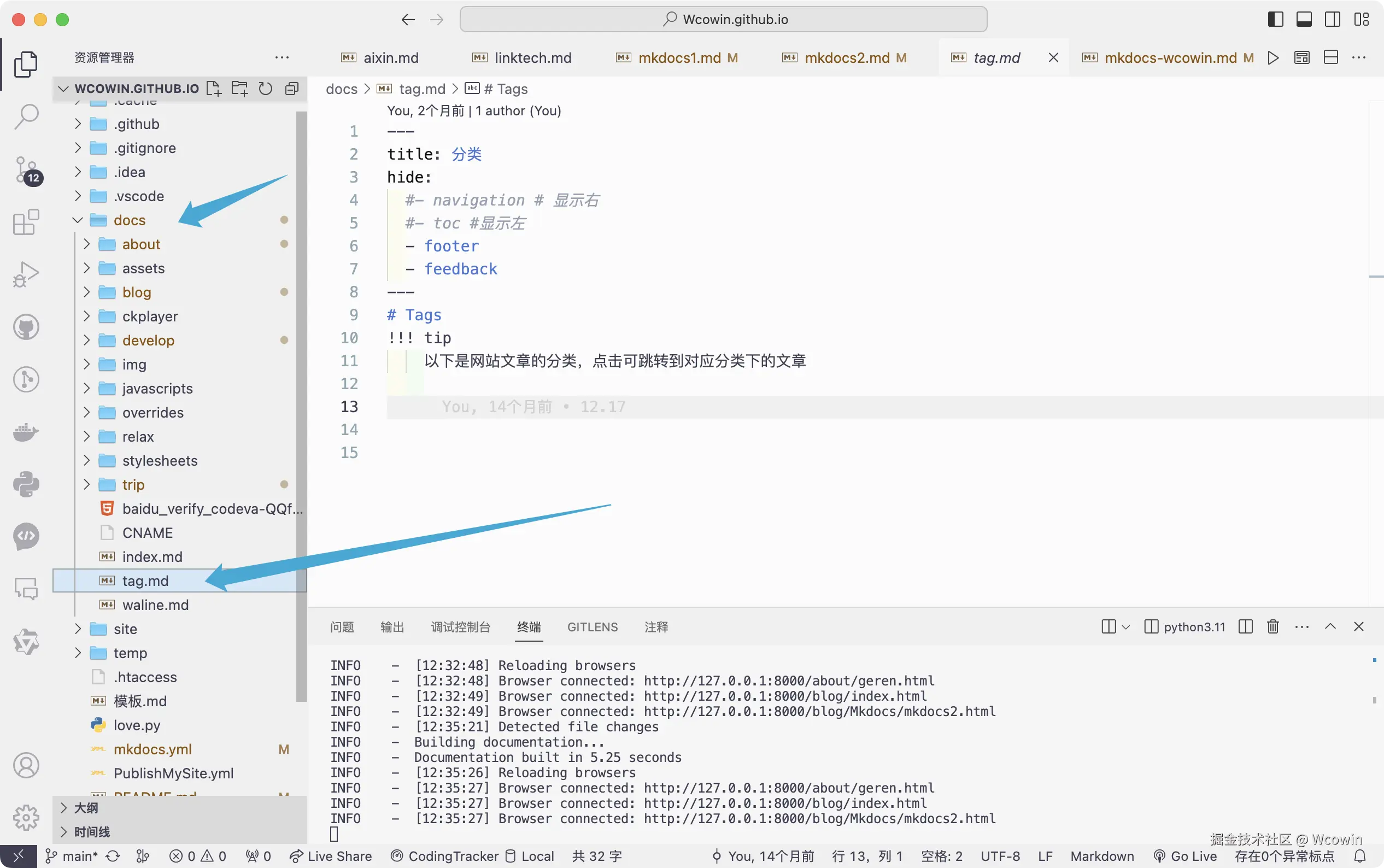 可能看起比较复杂,总结一下就是:我想写一篇文章在docs/blog下写一篇名为Wcowin最帅的文章,首先在docs/blog下新建一个xxx.md文件,里面写写东西,再去mkdocs.yml里找到nav,这样写: