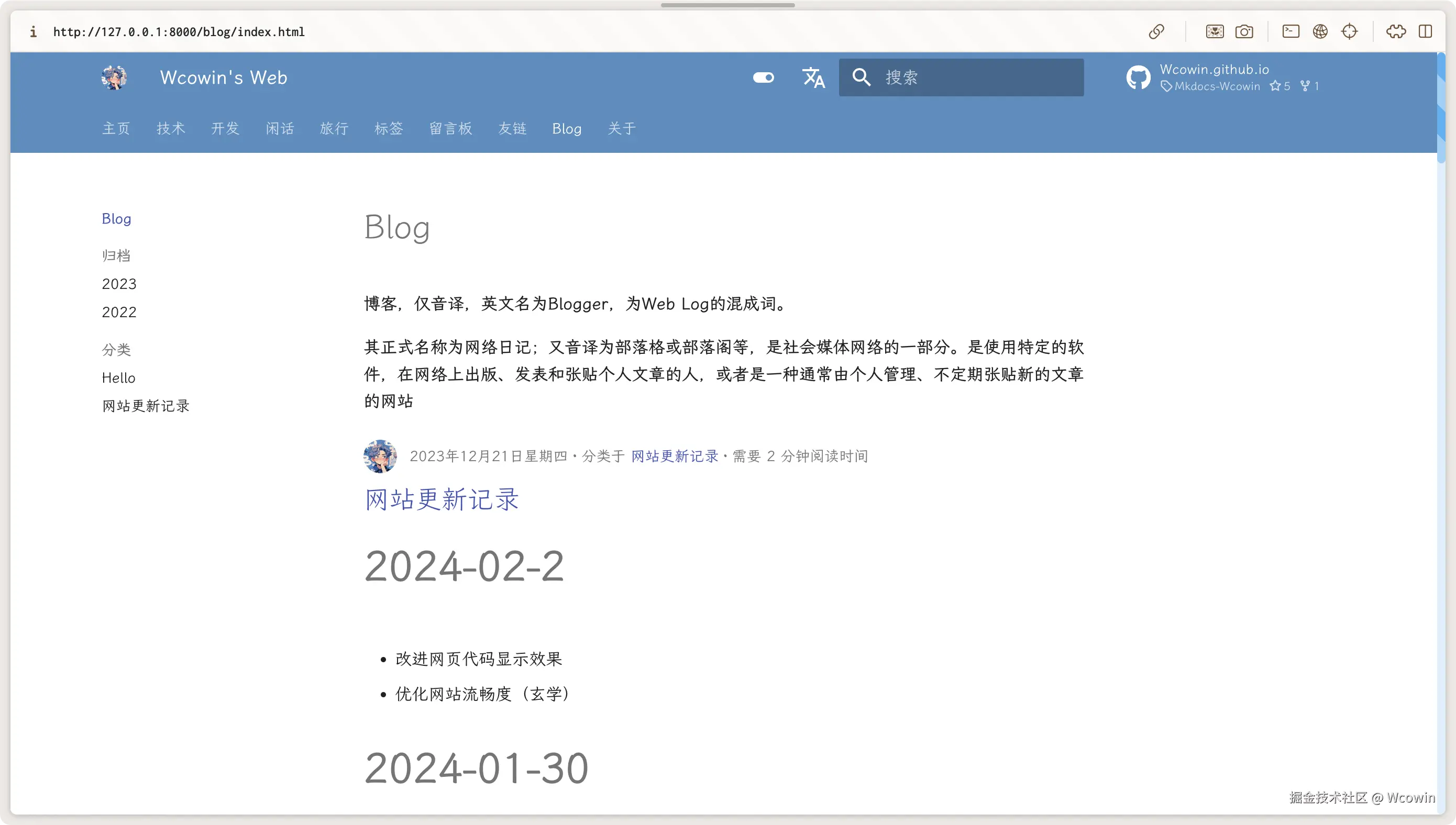 -blog 即博客,可以在docs/blog/posts里直接写md文件(不需要在nav里写路径),然后在上述nav里写