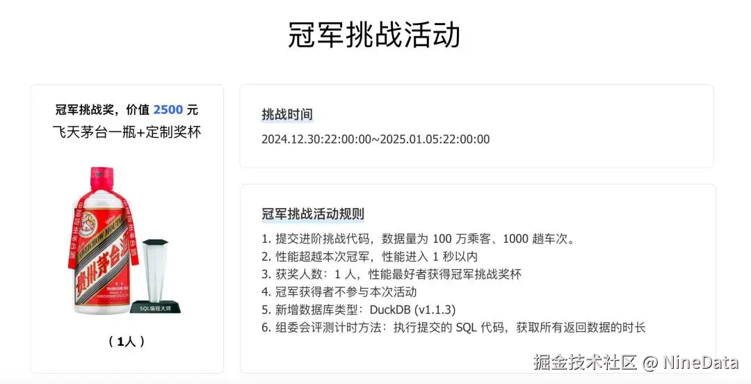 特别设立冠军挑战奖,完成挑战的选手将授予【终极 SQL 编程大师】的荣誉称号,另外性能第一名的选手的奖品为价值 2500 元的飞天茅台一瓶。此次活动于 2025 年 1 月 5 日 22:00 圆满落幕。
