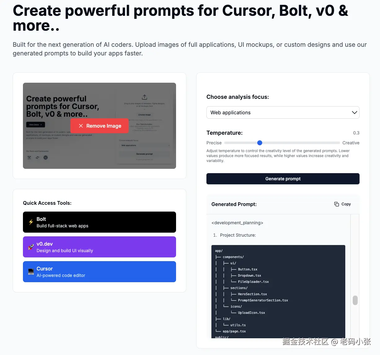 生成的 Prompt 不仅结构清晰,而且完美适配主流的 AI 编码工具(比如 Cursor、Bolt 和 v0.dev)。工具还支持一键复制,直接粘贴到这些平台中,让你的开发流程丝滑流畅。