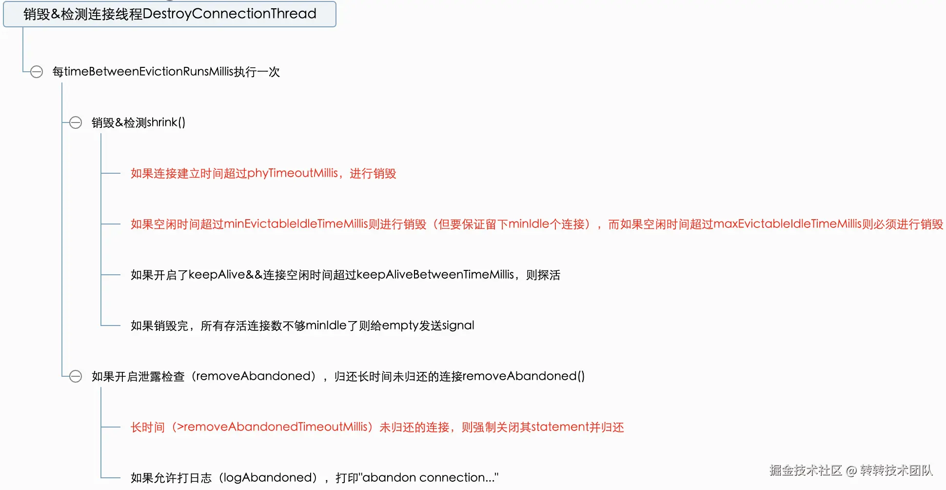 minEvictableIdleTimeMillis,则销毁(但要保证留下minIdle个);而如果空闲时间超过maxEvictableIdleTimeMillis则必须销毁; - 如果(