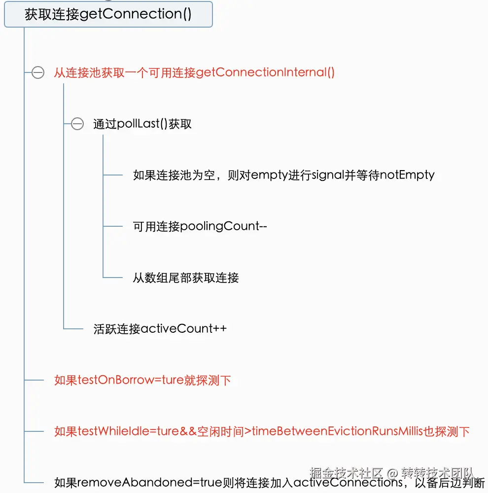 initialSize个连接;2)启动LogStatsThread、CreateConnectionThread、DestroyConnectionThread三个线程; - getConnection()获取连接:获取后会从连接池移除,