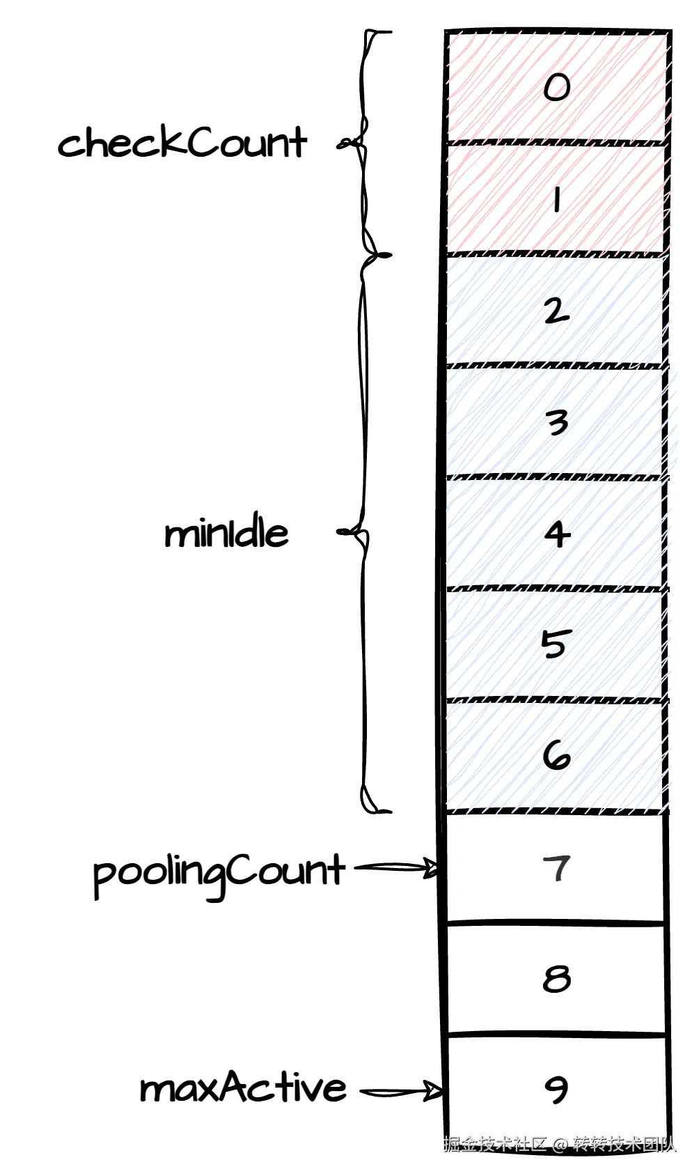 Druid连接池内部的数据结构如下(以minIdle=5,maxActive=10为例):
