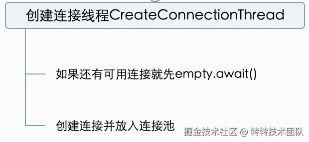 empty条件信号,并等待notEmpty条件信号。CreateConnectionThread收到empty信号后,如果满足条件则创建一个新连接,也会发出notEmpty条件信号;如果不满足,则忽略此次empty信号。 - 回收连接时:连接放回连接池后,会发出