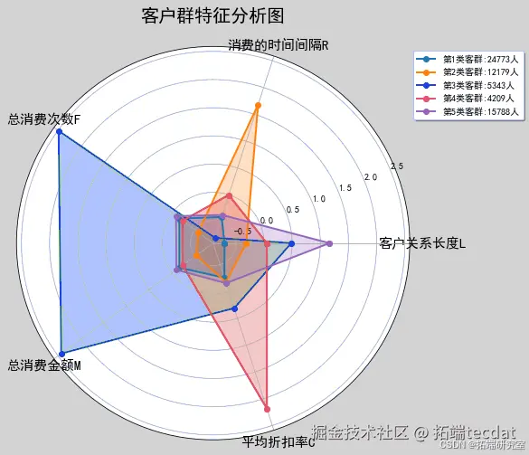 基于聚类结果,我们绘制雷达图来对不同客户群体的特征进行可视化分析: