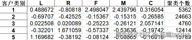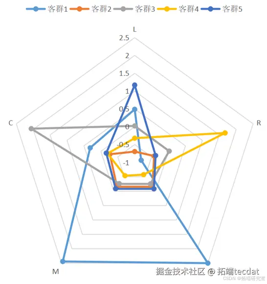 将客群按照客户价值聚类划分为五类贴上群体标签,记为1、2、3、4、5五类,对聚类结果进行特征分析,其可视化图形如下: