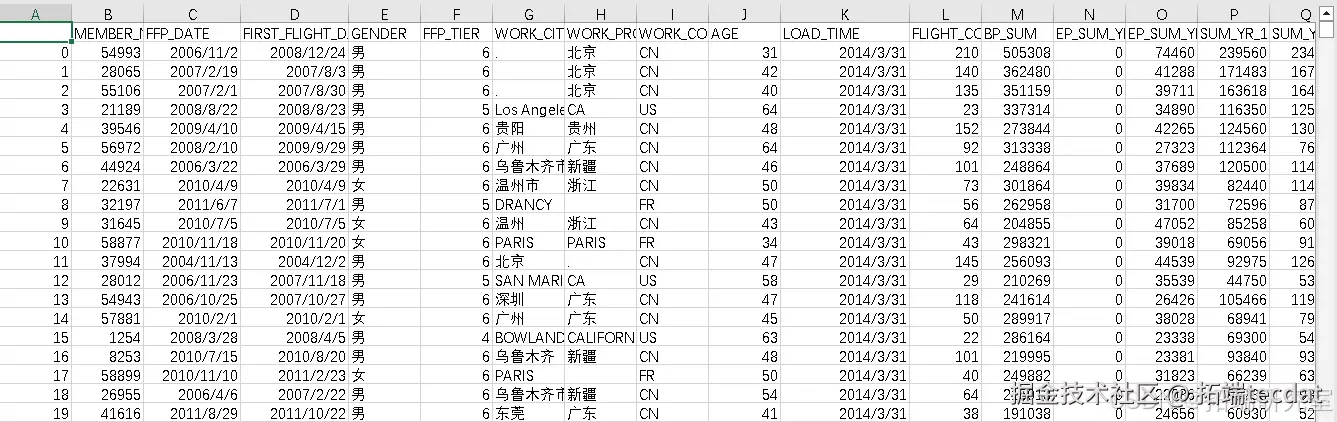 接着,从指定路径读取航空公司的客户数据文件,并查看前10行数据,了解数据的大致样貌,代码如下: