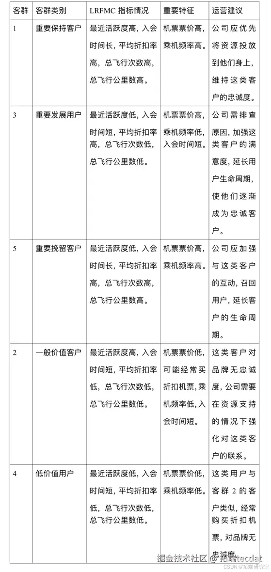 综上所述,通过对航空公司客户数据的深入分析和聚类处理,我们清晰地划分出了不同价值的客户群体,航空公司可以依据这些分析结果,制定精准的营销策略,合理分配资源,实现更好的运营和发展。