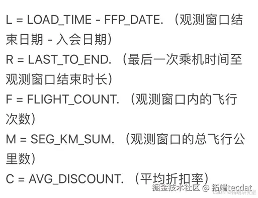 在进行客户价值分析时,我们选取了几个关键的指标来综合衡量客户价值。其中,R代表最近消费时间间隔,具体是用最后一次乘机时间至观察窗口末端时长来衡量;F表示消费频率,也就是观测窗口内的飞行次数;M体现消费金额,由于航空票价受到距离和舱位等级等多种因素影响,这里的舱位因素考虑舱位所对应的折扣系数平均值,距离因素则是一定时间内累积的飞行里程;另外,考虑到航空公司的会员系统中,用户入会时间长短对客户价值有一定影响,所以增加了指标入会时间长度,即客户关系长度,通过观测窗口的结束时间减去入会时间(单位为月)来计算,也就是LOAD_TIME - FFP_DATE。