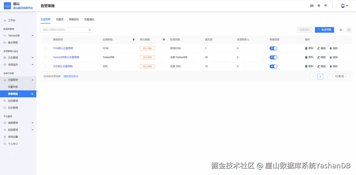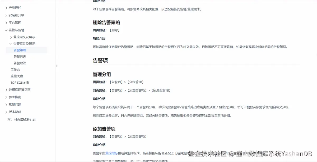 YCM上有"监控指标"和告警项配置,监控指标是不可修改、删除的。告警项是可修改配置的,官网具体说明如下。