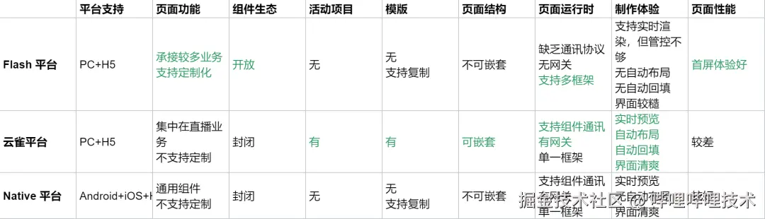 1. 环境原因:在公司提效的大背景下,需要整合统一各部门的活动搭建能力,比如活动业务的 Flash 平台、Native 平台、直播业务的云雀平台。通过横向对比各平台的技术能力现状及业务覆盖情况,最终选择基于 Flash 平台进行迭代升级: