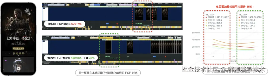 页面性能优化上线后,以《黑神话:悟空》活动为例,单页面 FCP 性能指标下降了 35%