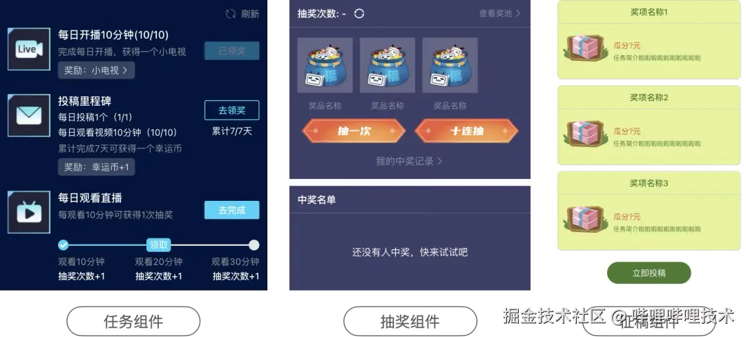 数据源配置入口与数据源组件配置表单直接绑定,让运营在使用上一气呵成,省去了来回跳转的麻烦。因此与一体化数据源面板一起重新设计的,还有首批数据源组件:任务组件、抽奖组件、征稿组件。不仅在组件功能和组件表单上做了对应的升级联动,还在数据源表单项上进行了重新思考,保留最核心的配置项,合理删减低频功能,下调高级功能的显示优先级,为运营进一步减赋提效。