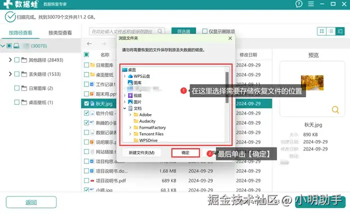 步骤3: 最后在【浏览文件夹】中选择自己恢复文件的存储位置。
