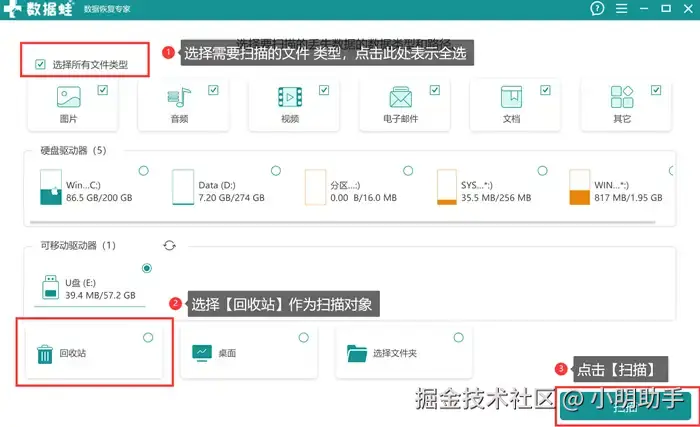 步骤1: 选择自己需要恢复的数据类型(建议直接勾选【选择所有文件类型】),再勾选上【回收站】,最后点击【扫描】。