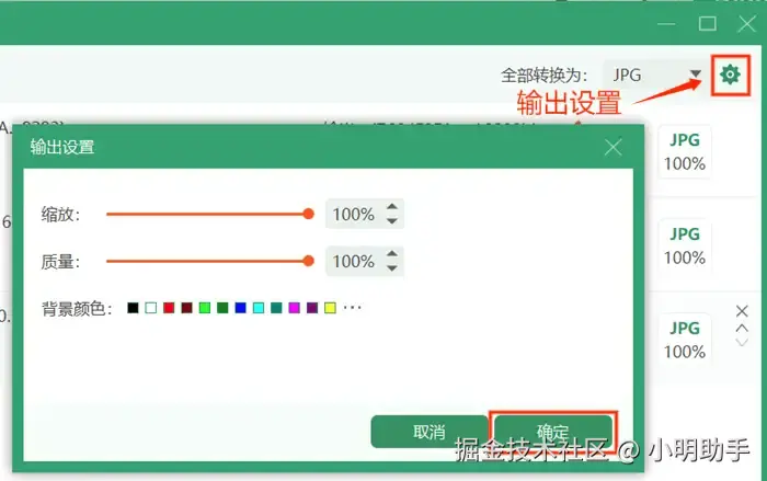 第三步:如果有需要的话,点击右上角的绿色齿轮按钮,进行缩放比例、背景颜色等输出设置。