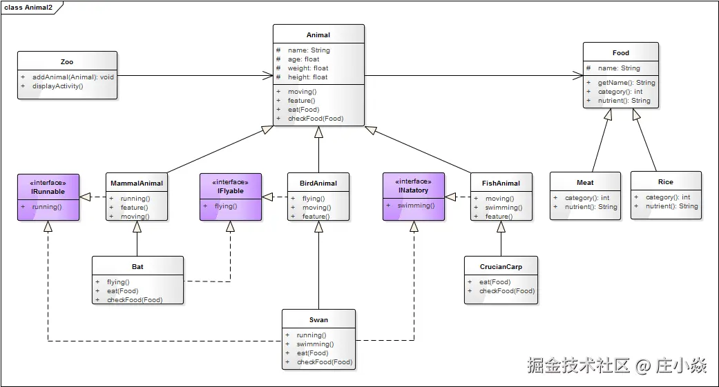 IRunnable表示奔跑行为。IFlyable表示飞行行为。INatatory表示游泳行为。
