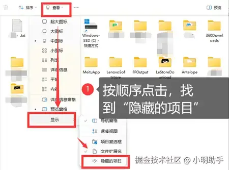 打开出现数据丢失问题的磁盘,在上方选择“查看”,选择“显示”,最后点击“隐藏的项目”,让被隐藏的文件重新显示出来。